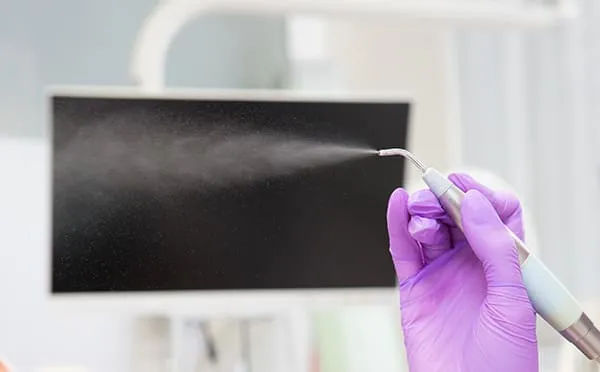 微細なパウダーを用いて歯面の汚れを除去するエアフローを導入しています。着色やバイオフィルムの除去に使用し、予防処置の一環として行っています。