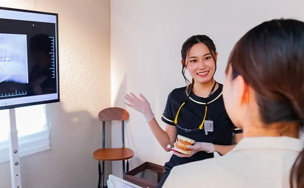 担当歯科衛生士がご要望を伺い、ライフスタイルや目標とする白さに合わせた方法をご提案します。ただ白くすることを目的にするのではなく、肌や歯ぐきとのバランスなど口元全体の印象を考慮します。処置前には虫歯や歯周病の有無を確認し、ホワイトニングが可能な状態かを診査します。